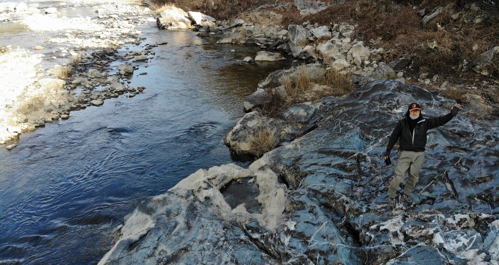 このようなアウトドアアクティビティはお手のもの。韓国にてカワウソのフィールド調査中。カモフラージュをつけて。[写真:岡本篤]