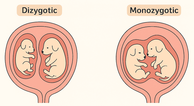 また、多胎であるということは、複数個の卵子を排卵する機能を備えているということでもあり、排卵期間中であれば異なるオスと交配することで、それぞれの卵子が別のオス犬の精子と受精することも可能です。一方、単胎である人は、通常は一個の卵子が排卵されます。しかし、なんらかの理由で複数の卵子が排卵されることもあり、二つの卵子が受精すれば二卵性双生児となります。