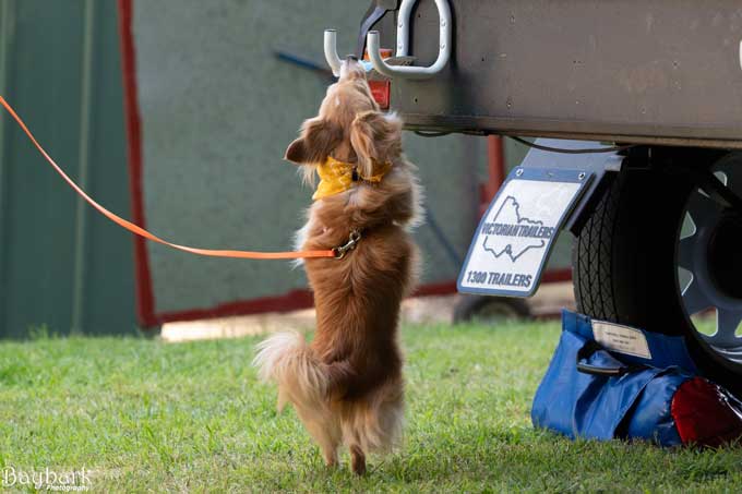 競技会場に着いたら、最初にイナリの首にイエローバンダナをつける。この黄色またはオレンジ色のバンダナは「この犬はリアクティブ(人や他の犬など外部の刺激に対して恐怖やストレス、興奮といった感情から極端な反応を見せる行為)」であることを周りの人たちに知らせるためのものだ。リアクティブな犬はバンダナの着用が義務付けられている。また周りのハンドラーはバンダナをつけた犬とは、十分な距離をとらなければならない。