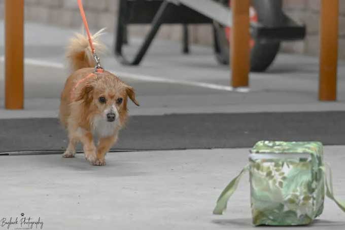 ゼッケン番号を呼ばれたら競技エリアへ進む。イナリはリードを引っ張るように走って向かう。早くノーズワークをやりたい気持ちが伝わってくる。