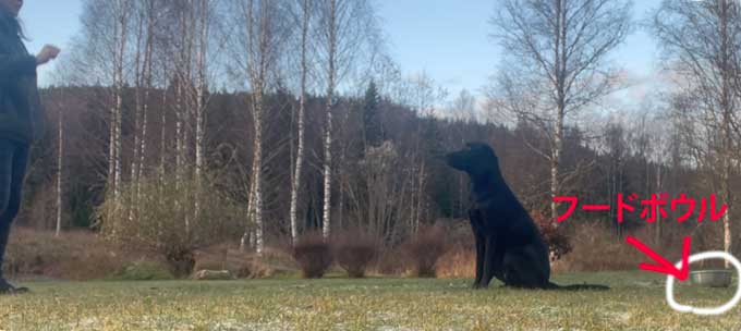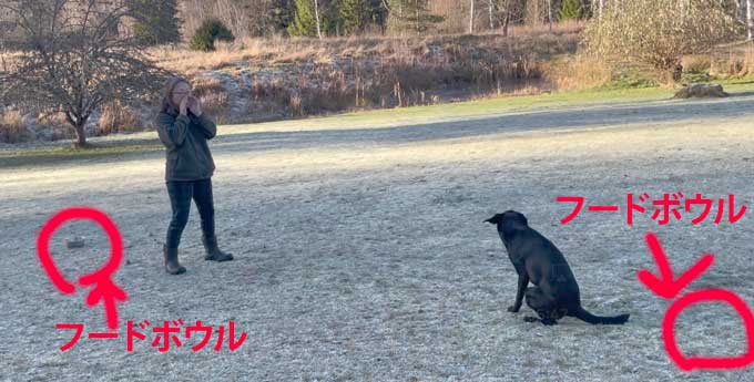 手順としては前述したものと同じだ。犬は座りハンドラーは正面に立つ。そして犬の背後にはフードボウル、そして、犬の目の前にもトリーツのはいったフードボウル。