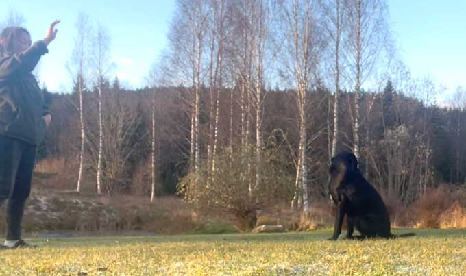 犬といっしょに歩き、トリーツの入ったボウルを地面に置く。ただし、すぐには食べさせない。そのボウルを後にし、いっしょにさらに5歩き、犬に座ってもらう。ハンドラーは犬と向かい合う形で立つ(下写真参照)。