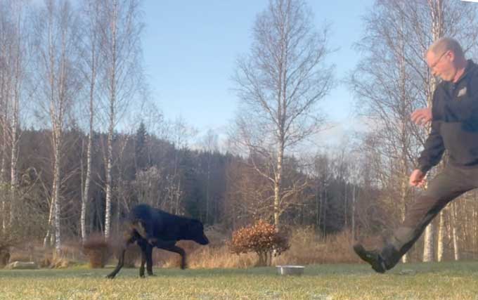 3をコンスタントにこなすようになったら、次は、ディストラクションを置く段だ。完成図としては犬のすぐ目の前に置いて、「うしろ!」のコマンドを出し、ディストラクションを無視して、後にいってもらう。しかし最初は、ディストラクションは犬のそばではなく、ハンドラーのすぐ後に置いておく。目の前の誘惑に釘付けになっても、思考の切り替えができ、言葉に従って行動できるか。これこそが認知コントロールトレーニングのキーとなる。