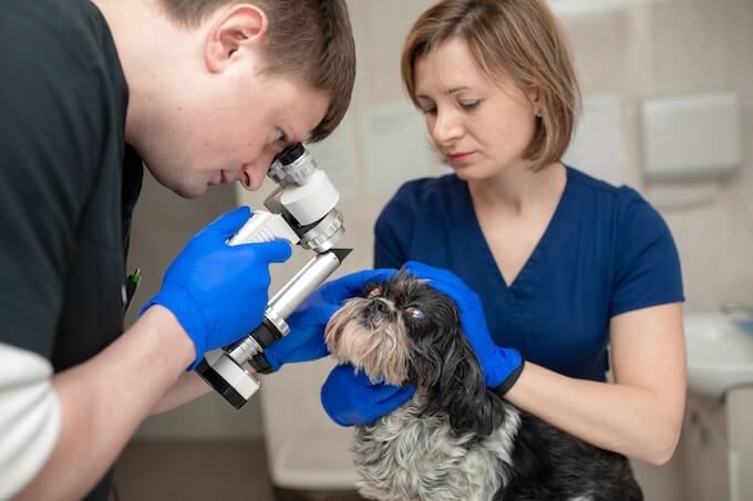 緑内障には原発性と続発性があります。原発性緑内障は遺伝的要因が関連すると考えられており、中でも、原発閉塞隅角緑内障が犬に一般的に発症するものとして知られています。犬の原発性緑内障の多くは、隅角の形成異常などの構造的異常が主因とされています。続発性緑内障は、白内障やぶどう膜炎、水晶体脱臼、眼内腫瘍など別の疾患があり、それにより二次的に引き起こされるものです。